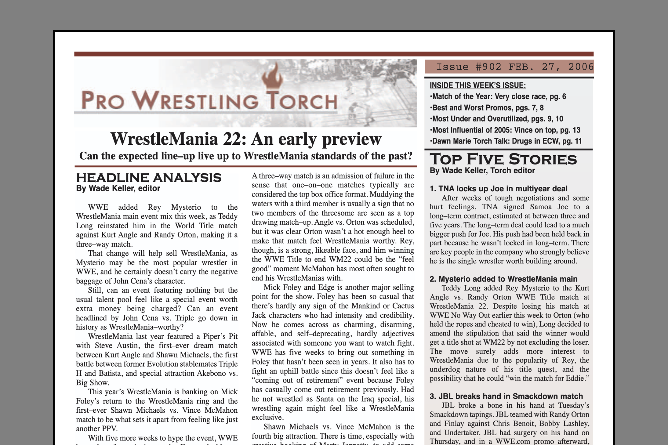 VIP 2005 BACK ISSUE – Pro Wrestling Torch #902 (February 27, 2006): WrestleMania 22 Early Preview, Most Influential People of 2005 List, 2005 Torch Awards, Torch Talk with Dawn Marie