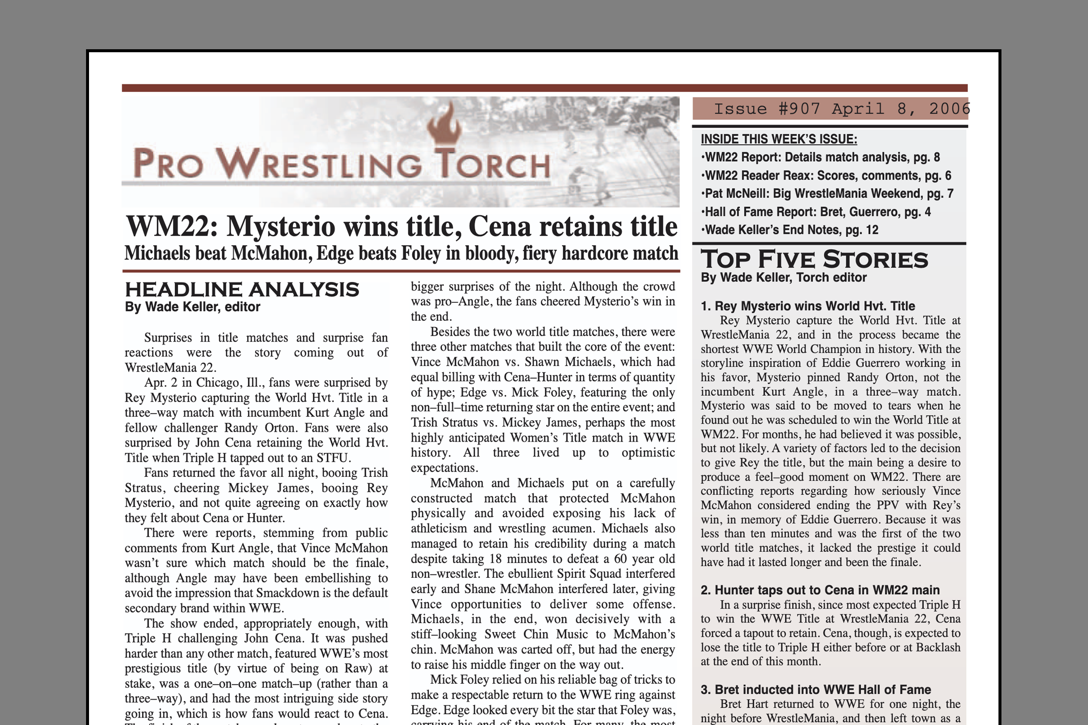 VIP 2005 BACK ISSUE – Pro Wrestling Torch #907 (April 8, 2006): WrestleMania 22 Coverage including Keller Report, Roundtable Reviews, Hall of Fame, Keller analyzes Austin’s comments on Hulk Hogan, more